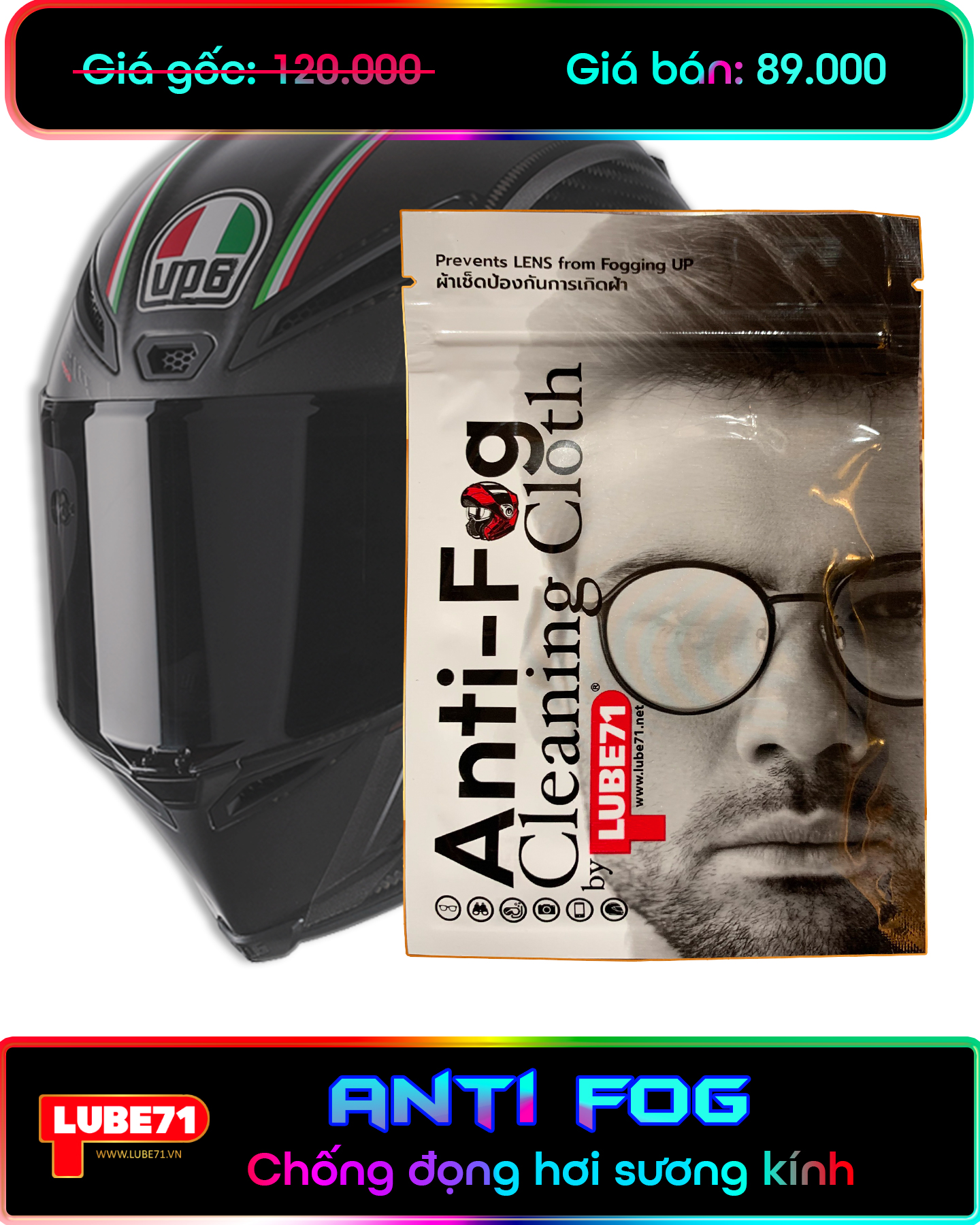 ANTI FOG là sản phẩm chống đọng sương mặt trong của kính nón bảo hiểm, kính cận.